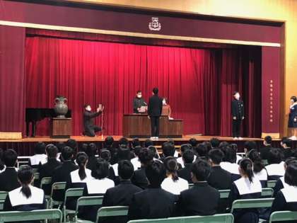 いよいよ明日が75期生の卒業のときとなりました。本日は予行を行い、そして、2年生の代表生徒からコサージュの贈呈を受けました。