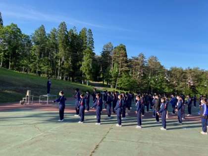 郡上高原での朝の集いです。本日は快晴で、山々の美しさが際立っています。