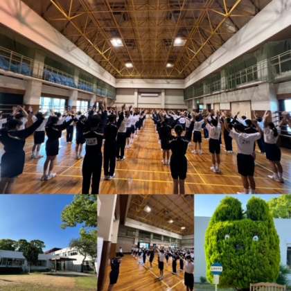 体調不良者もなく、元気に集合し、体育委員の号令のもと、しっかり身体を動かすことができました。外は雲ひとつ無い晴天です。