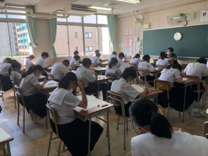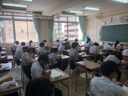 3年生では、大阪府中学生チャレンジテストが実施されました。台風が接近していたこともあり、実施ができるか不安でしたが、無事に終了しました。結果は少し先になりますが、2学期はテストが多いので、毎回振り返りながら、次への準備を重ねていってください。1・2年生においては、課題テストでした。夏休みの成果をこのテストで確認してください。積み重ねが大事です。