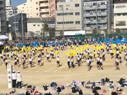 大江小の運動会が天王寺中学校のグランドにて、開催されました。11月12日、素晴らしい秋晴れの中で、児童たちはさまざまな競技や演技を披露してくれていました。