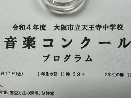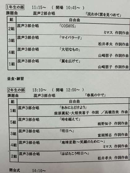 明日、1年生および2年生の音楽コンクールが開催されます。当該学年の保護者の方は、事前の申し込みなしで観覧いただけます。1年生の部は10時45分〜11時05分、2年生の部は12時50分〜13時10分が受付時間となっておりますので、どうぞよろしくお願いいたします。