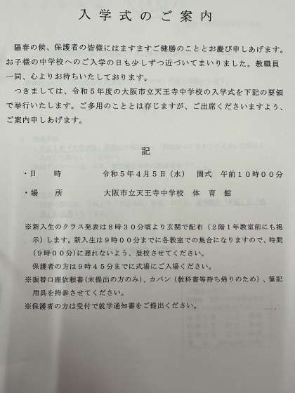 明日は令和5年度の天王寺中学校入学式となっております。新入生にとっては、新しい学校生活のスタートとなります。皆様にとって、素晴らしい入学式となるようよろしくお願いいたします。