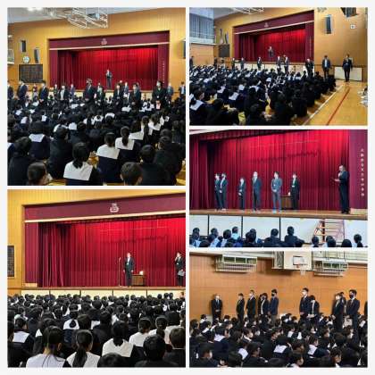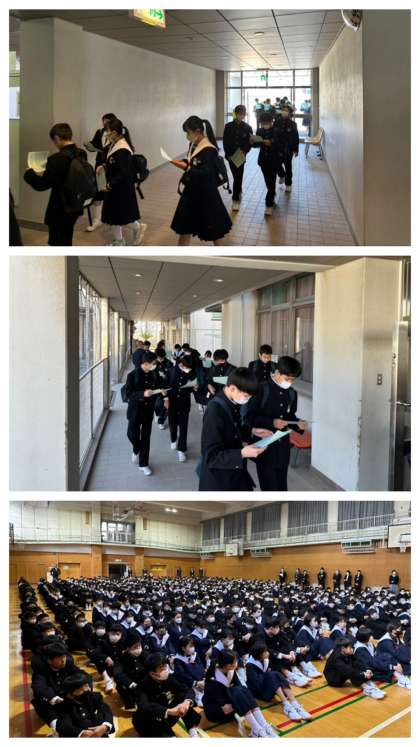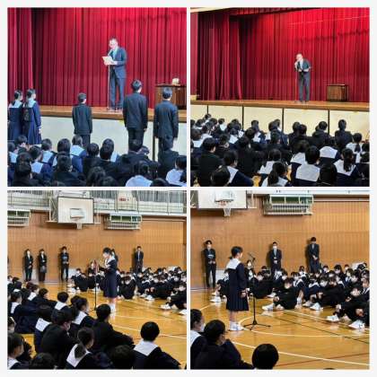 本日は、3学年の生徒が揃い、新校長先生の着任式及び新転任の教職員の着任式を行いました。その後、長畑新校長先生より、令和5年度の担当教員の発表があり、始業式を行いました。いよいよ令和5年度のスタートとなります。そして最後に、新入生と在校生の対面式をおこない、新入生代表が誓いの言葉を、在校生代表が歓迎の言葉を述べました。天王寺中学校での生活をみんなの力で充実したものとなるようにしていきましょう。