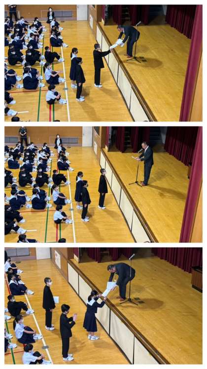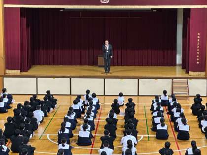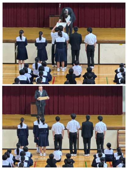 全校集会にて、学級役員の認証式、表彰の伝達、そのあと、校長先生より「いじめ(いのち)について考える日」の講話がありました。