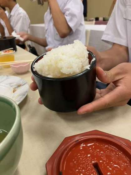 男子が昼からのラフティングに向けて、ご飯をモリモリ食べてます。