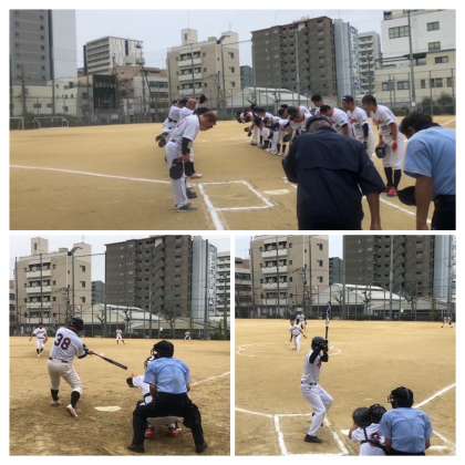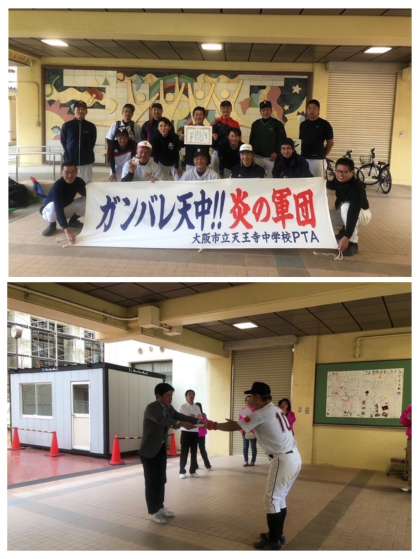 9月の天王寺区の男子PTAソフトボール大会で天王寺中学校男子PTAソフトボールチームが優勝したことにより、本日、中央区の瓦屋町グランドにて、市PTA親善ソフトボールブロック大会に天王寺区代表として出場しました。