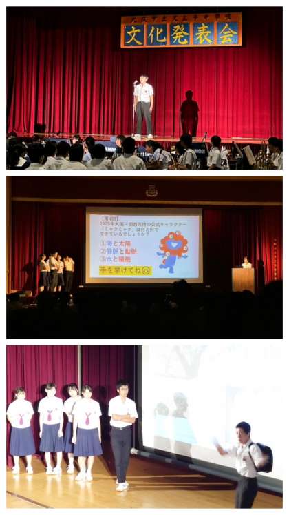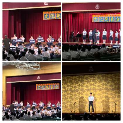 舞台の部は、1部が1,2年生で、2部が3年生と保護者の方の組み合わせで解されました。内容は、文化祭実行委員長の挨拶から、校長先生のお話、合唱部、3年生の修学旅行報告、生徒会のクイズ、そして吹奏楽部の演奏、最後に文化祭実行副委員長の閉会の言葉で締めくくりとなりました。