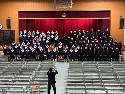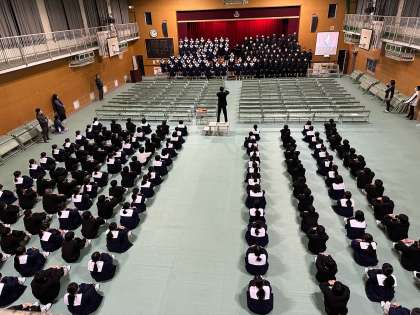 来週の水曜日は77期生の卒業式となります。在校生は代表生徒のみの参列となるため、3年生の全員合唱を1年生に披露しました。圧巻の合唱に感動の渦となりました。来週の卒業式予行では2年生が3年生を見送ります。卒業生も在校生も体調管理をお願いします。