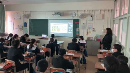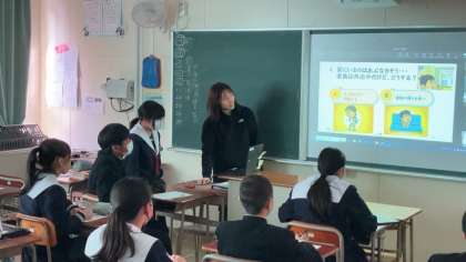 今日の授業は、田邊先生が2年3組の教室からTeamsを使って2年生全クラスを繋いで行いました。