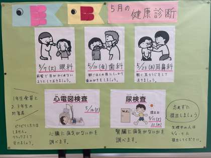 ゴールデンウィーク明けの7日(火)の眼科健診から始まり、23日(木)の耳鼻科検診まで5種類の検診があります。