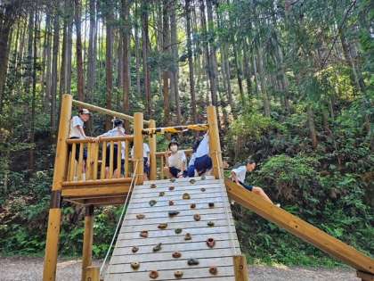 一旦つどいの広場まで下山してから、再び山に駆け上がってアスレチックを楽しんでいる生徒もたくさんいます。