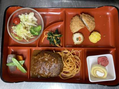 今日のメニューは、デミグラスソースのハンバーグ定食です。