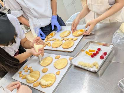 パティシエコースの先生や生徒さんたちからご指導いただき、オムレットをつくりました。