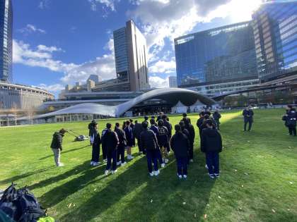本社では部長に向けて解決策の中間報告をさせていただくとともに、グラングリーン大阪では芝刈り体験をしました。
