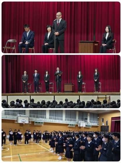 先日、卒業式が終わり3年生が巣立っていきましたが、本日は9人の教職員が本校を離れることとなり、生徒向けの離任式が行われました。
