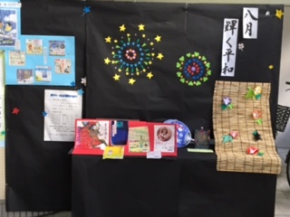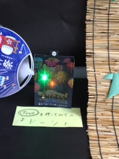 夏の風物詩、花火での『図書室ご案内』です。右の写真には「Pushを押してみて!」とあります。花火がドーンと打ちあがりますよ。玄関入ってすぐ右手にあります。