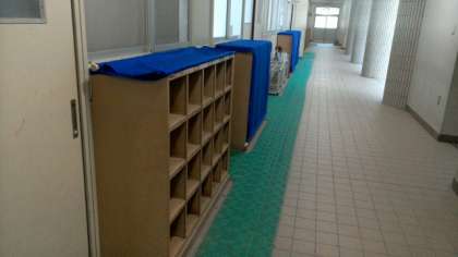 「多目的室前の下駄箱のスリッパが埃がかかりやすい」という生徒たちの意見から、「下駄箱に埃除けのカーテンを作ろう」ということになり、夏休みに家庭科部と技術