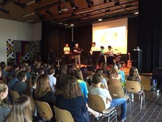 1時限目が終わり、盛大な送別集会を開いていただきました。大きな拍手で迎えていただき、2年生の生徒たちによる歌を披露していただきました。