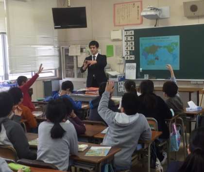 今日は期末テストの午後の時間を利用し、大江小学校の6年生2クラスで英語の授業が行われました。