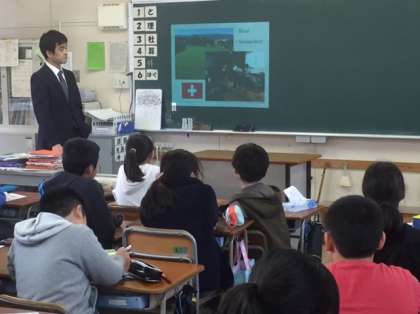 また、本校の特色の一つ、海外の姉妹校との交流などについても英語で紹介をし、英語の質問に答えることも行いました。