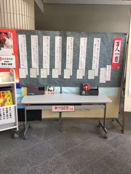 玄関ホールの図書室案内コーナーに展示されているのは、百人一首の一字決まりの歌です。「決まり字」とは、そこまで聞けば下の句が特定できる、上の句にある最小限の文字数のことです。決まり字がひとつのものを「一字決まり」と言います。このような「一字決まり」の句は、下のように全部で7句あります。