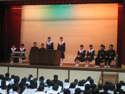 前期生徒会役員選挙の立会演説会、投票が行われ、会長1名、副会長2名、書記2名、会計1名が選出されました。日々のあいさつ運動や、行事等での活動など、みんなの中心となって活躍してください。