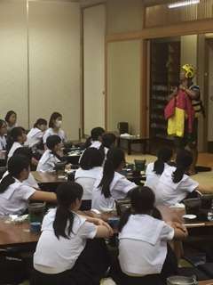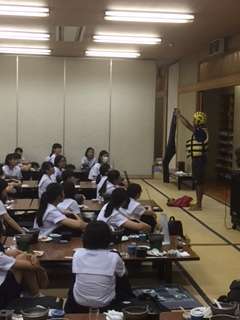 昼食を終え、インストラクターさんからラフティングの説明を受けています。