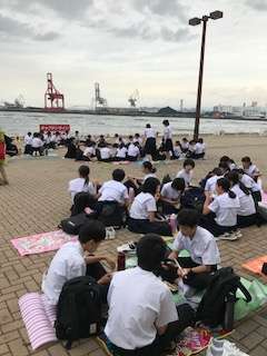 雨が束の間止んだので、昼食は海を見ながらのお弁当です。
