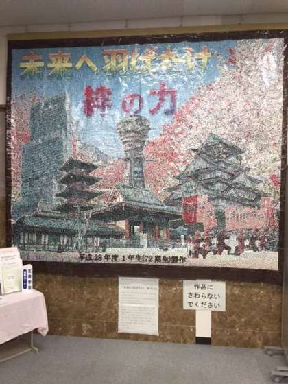天王寺区役所一階に、72期生が作成したモザイクアートと、卒業生の方が天王寺中に寄贈された本物の聖火トーチが展示されています。