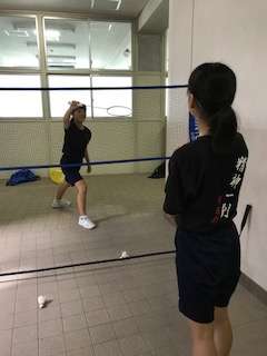 体育館では動きのある練習を中心に、廊下ではラケットワーク中心の練習をしています。効率よく練習して、大会での入賞を目指します!