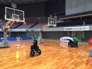 試合前には車椅子バスケットボールの体験コーナーに参加しました。