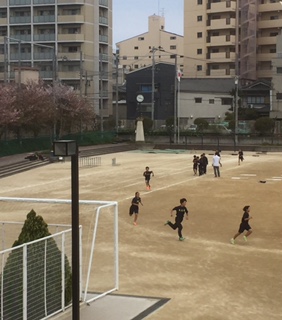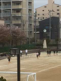 今日は少し肌寒いですが、昨夜も大雨にならず、運動場の桜の花もまだ咲いています。桜のもとで、陸上部が練習中です。