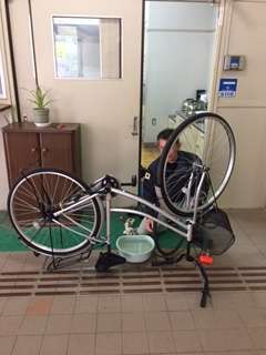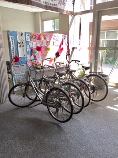 管理作業員さんは担任の先生が乗って行く自転車を、丁寧に点検・修理をしてくださっています。担任の先生達は今日訪問させていただくご家庭の場所を地図で確認したりと、学校でも家庭訪問に向けての準備をしています。