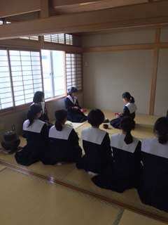 本日の部活動の様子 第二弾は茶道部です。茶道部ではお点前の作法を、先輩が1年生にひとつひとつ丁寧に教えていました。周りの部員たちも正座をして見守っています。2年生、3年生の先輩たちにとっては苦にならない正座ですが、まだ1年生にとってはしんどいようです。しかし、座った姿勢もきれいでしたよ。