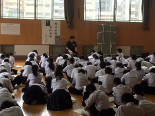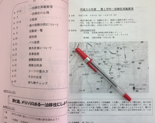1年生は6月に行われる一泊移住に向けて、しおりを使って行程などの確認をしていました。
