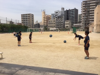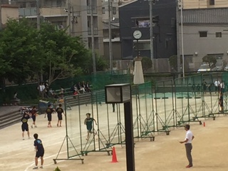 運動場では、陸上部とサッカー部が活動中。それぞれ練習に励んでいます。投てき競技のトレーニングに短距離走。熱心に練習をしています。サッカー部は一部試合にも行っています。