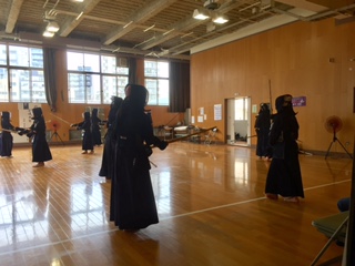 格技室では、剣道部が練習しています。竹刀で打ち合う音が、廊下まで聞こえてきました。未経験者は、竹刀の振り方から練習していました。