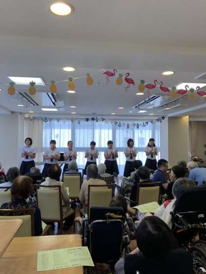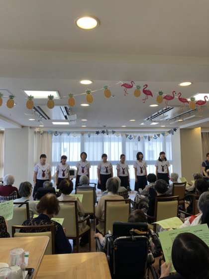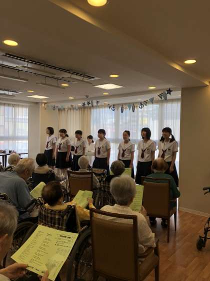 昨日合唱部2.3年生は、メディカルホーム「まどか天王寺」さんで合唱を披露させていただきました。入所者の皆さんの温かな拍手が嬉しかったです。『翼をください』や『川の流れのように』など7曲歌いました。