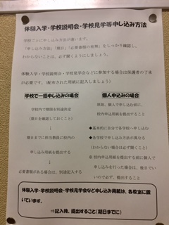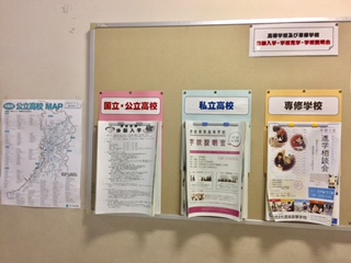 まだ1学期ですが、4月からたくさんの高校・専修学校の先生方が天王寺中学校を訪問してくださっています。3階の東フロアには多くの学校のポスターが、また各学級や廊下の掲示板に、体験入学・学校説明会・学校見学の案内がたくさん掲示されています。