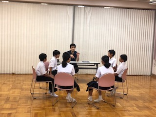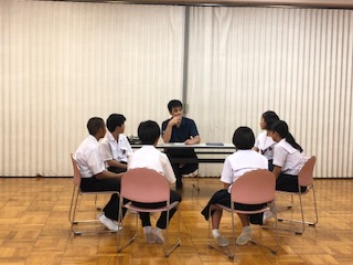 7月10日(火)1年生の英語の時間、グループで1つのテーマについて英語で話をする会話テストをしていました。1学期に授業で学習した文法事項を使って、簡単な英語で話をしてみる取り組みです。