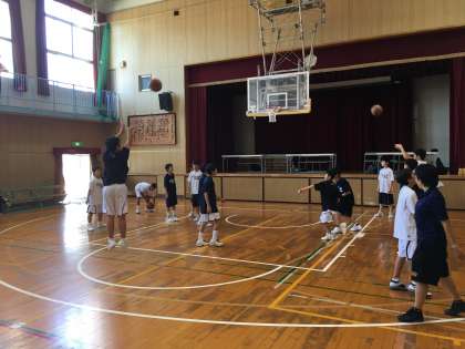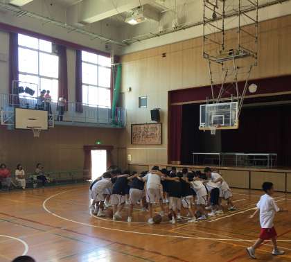 男子バスケ部が阪南中学校との決勝戦に臨みます。試合開始まで間も無くです。勝って一位になれるよう頑張ります。