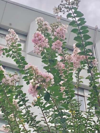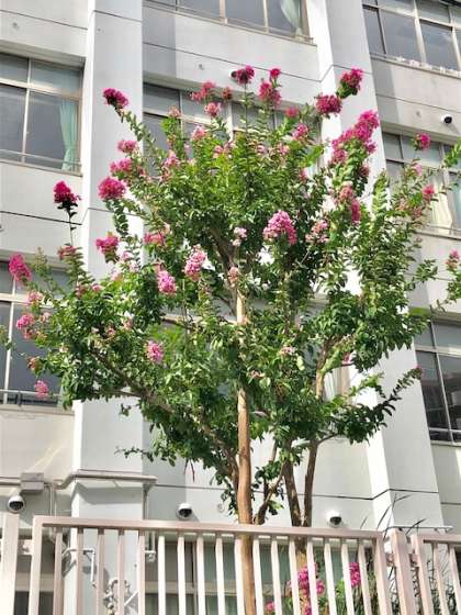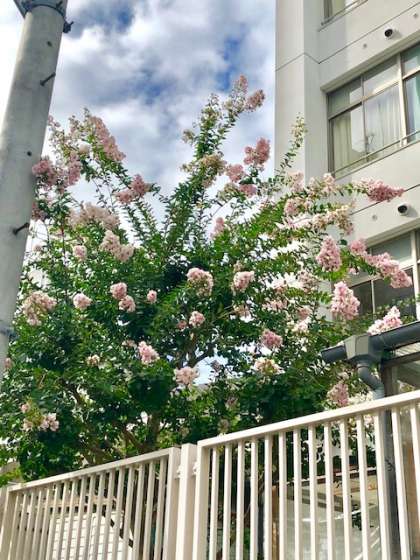 正門から西側、ちょうど1,2組の教室の下の辺りにあるサルスベリ(別名は百日紅)の花が最盛期をむかえています。