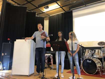 スイス姉妹校オーバーヴィル中学校で歓迎集会を開いてくださいました。