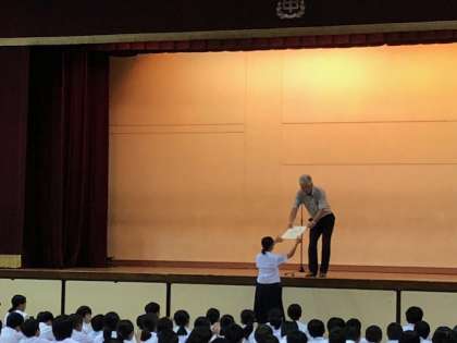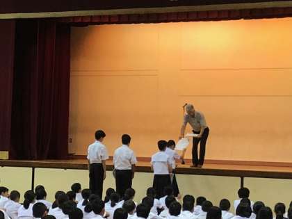 9月10日(月)全校集会が行われ、陸上部、男女バスケットボール部、柔道部の表彰がおこなわれました。先週に続き、夏休みの部活動の頑張りが多くの表彰されました。