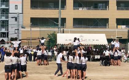 先週の土曜日に天王寺中学校を会場に行われる予定でしたが、台風の影響で、本日午前中、大江小学校での開催となりました。秋晴れの下、全学年団体種目や団体演技を一生懸命行なっていました。写真は5,6年生による騎馬戦と組立体操の様子です。素晴らしい演技でした。