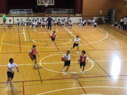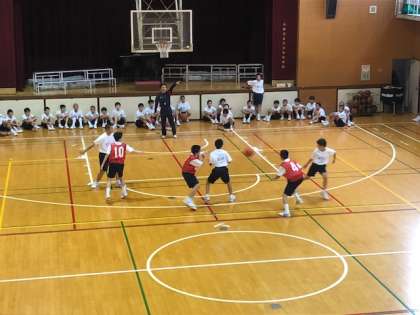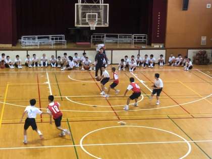 1年生の男子体育の授業では、バスケットボールを行なっていました。どのようなディフェンスをすればよいのか、どのようなパスを投げたらよいのか、丁寧な解説と共に、実践練習をしていました。