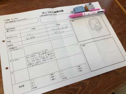 2年生の国語の授業「本のポップを作ろう」の様子です。各班で紹介したい本を決め、その本を紹介するポップの文章や図案などアイデアを出し合って話し合う、ポップ作り編集会議を班ごとに持っていました。