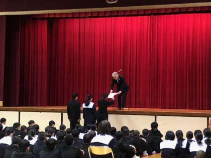 10月29日(月)全校集会において、学級役員認証式が行われ、各学年委員長が代表して認証状を受け取りました。