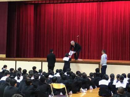 本日の全校集会の中で、10月20日(土)に行われた「第37回スポーツフェスタ2018大阪」に参加した生徒の記録の紹介と、金メダルを獲得した3年生男子と1年生女子のメダルの授与が行われました。